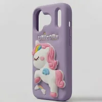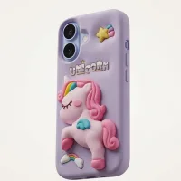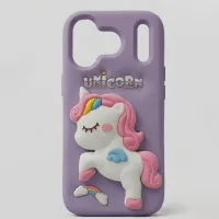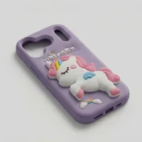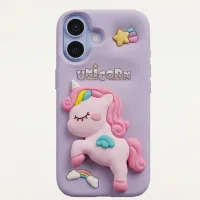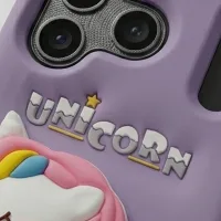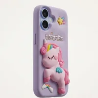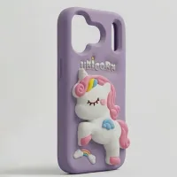 Bring a little magic to your everyday carry with our enchanting Unicorn 3D Silicone Case. Wrapped in a soft dreamy lavender purple, this case features a beautifully detailed full-body 3D unicorn character at the center — pink and prancing, with a flowing rainbow mane, teal wings, and delicate closed eyes that give it a peaceful, fairytale charm. Surrounding the unicorn are embossed rainbow and cloud accents at the bottom, a golden shooting star near the camera, and a playful UNICORN wordmark rendered in chunky embossed lettering. It's whimsical, it's girly, and it's completely irresistible.